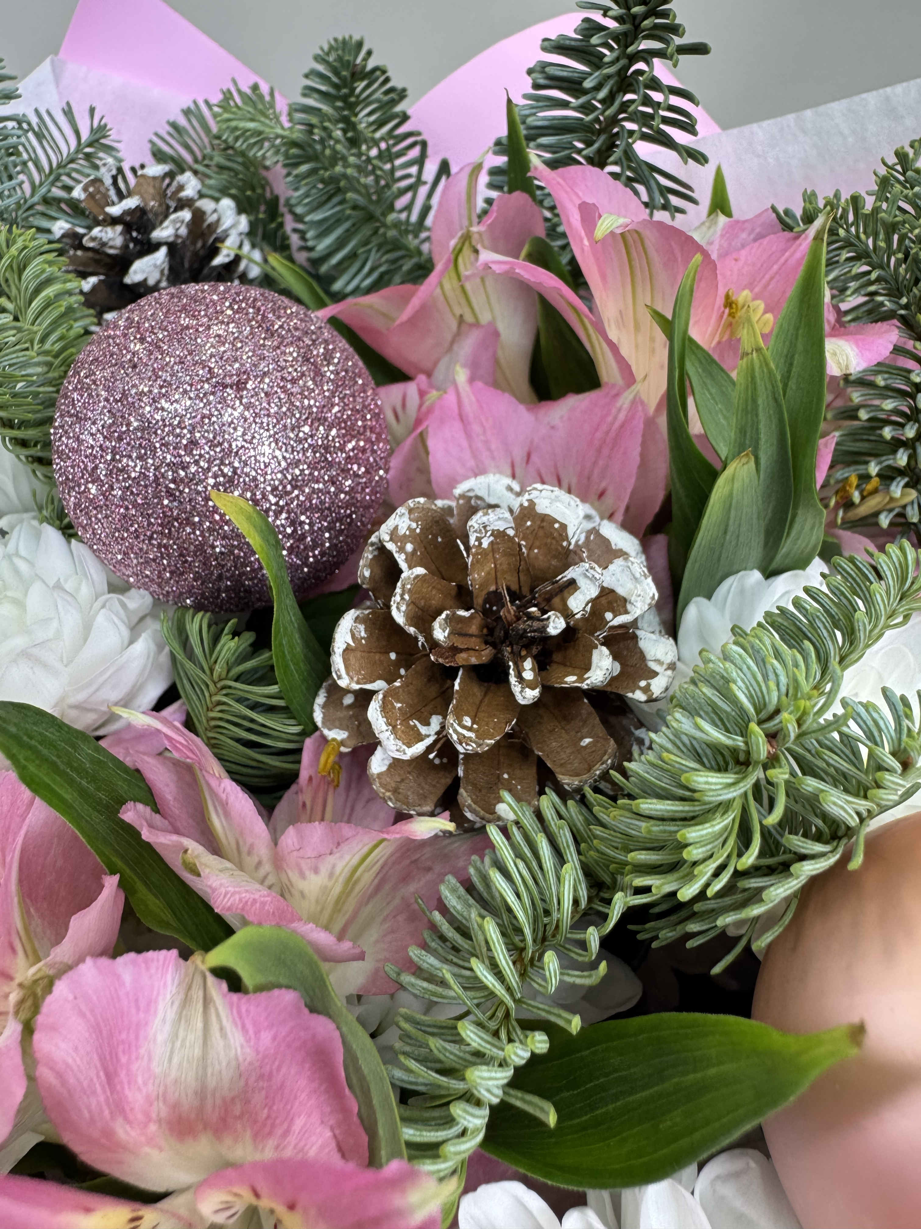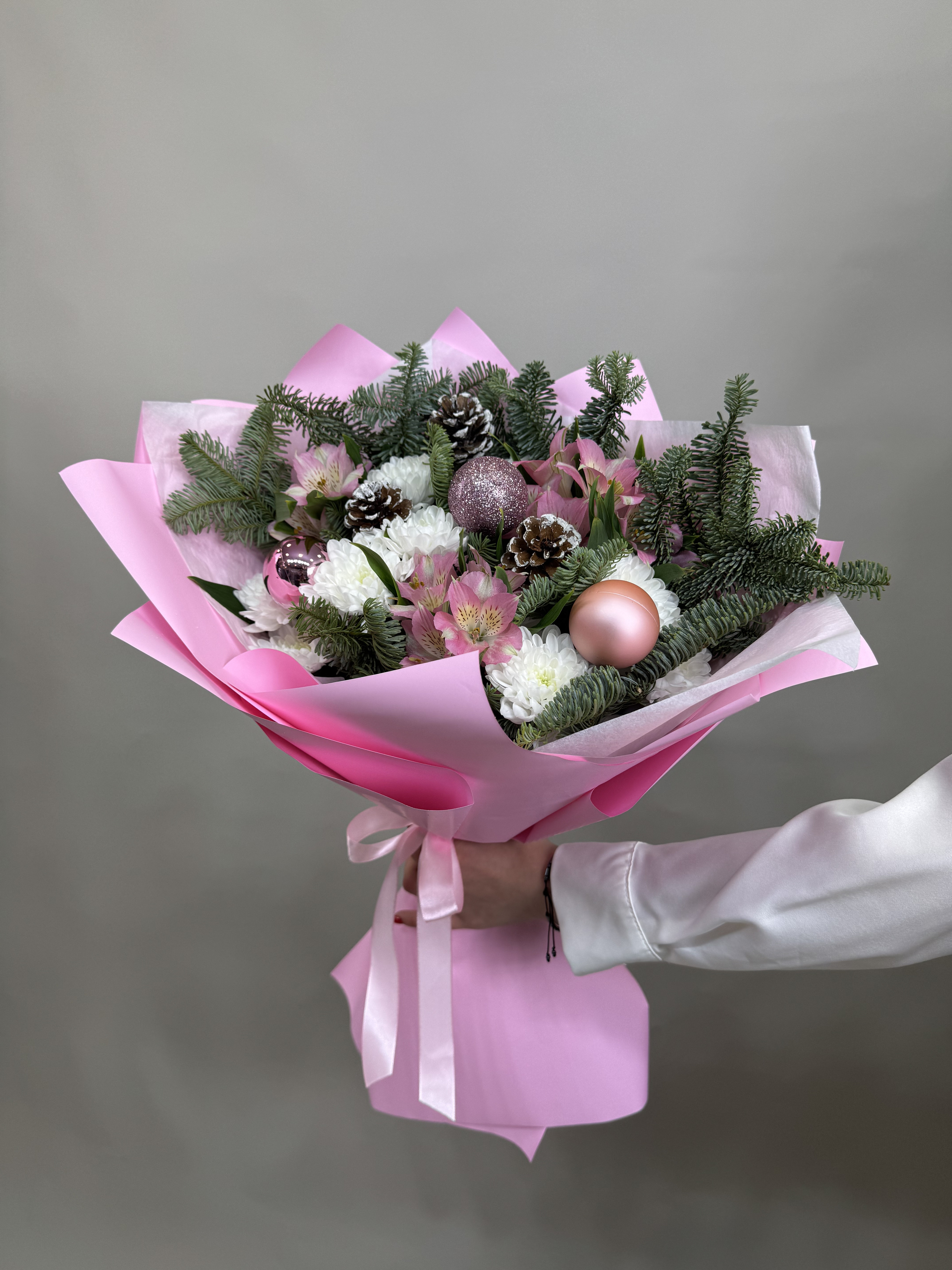 Нобилис Шарик (новогодний елочный) Шишка натуральная Хризантема кустовая Альстромерия Оформление букета